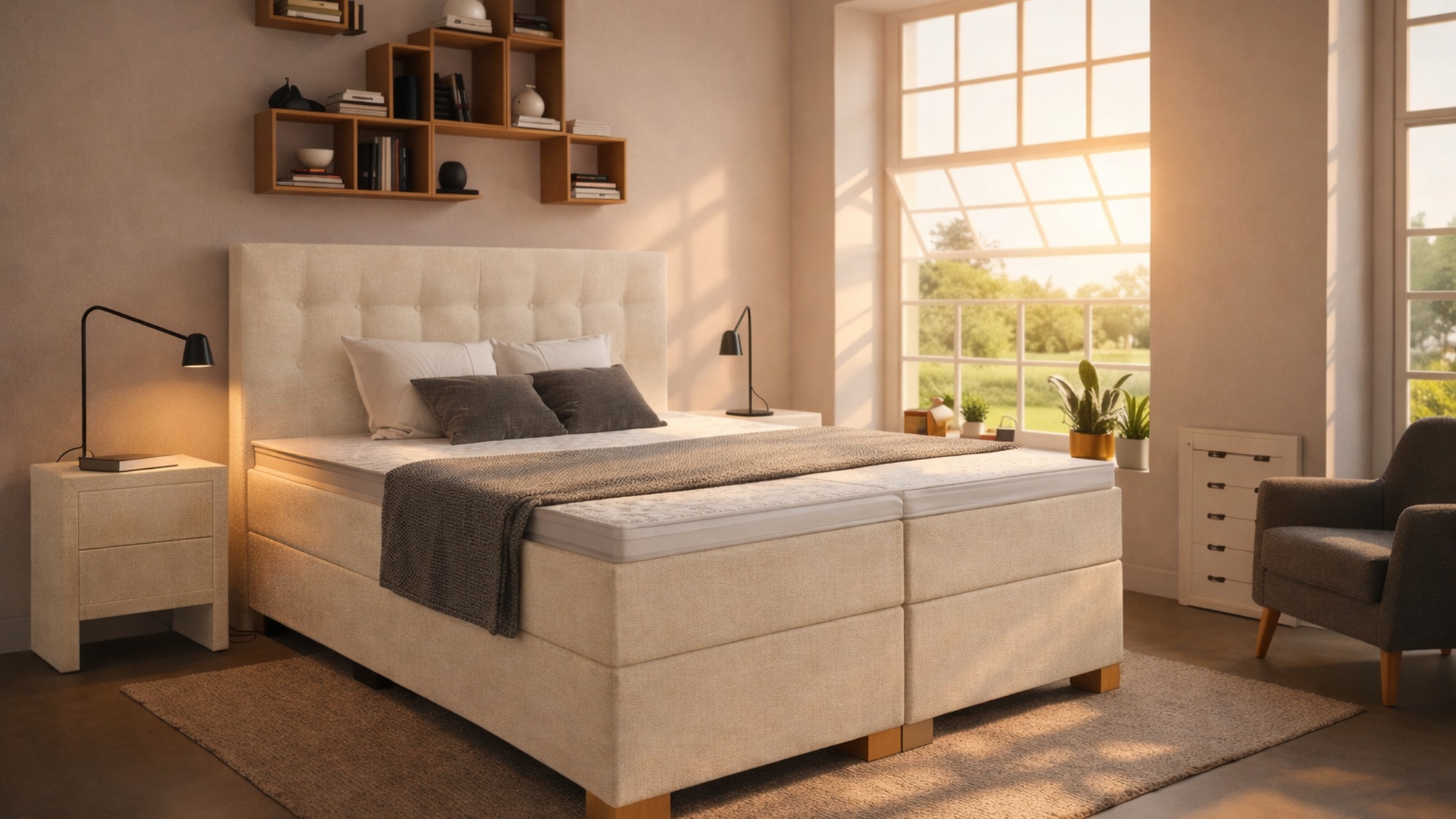 Matrassen: Mee gestoffeerde pocketvering matrassen met aan beide zijden een 4,5 cm HY40 comfortlaag. Totale dikte: ca. 21 cm.